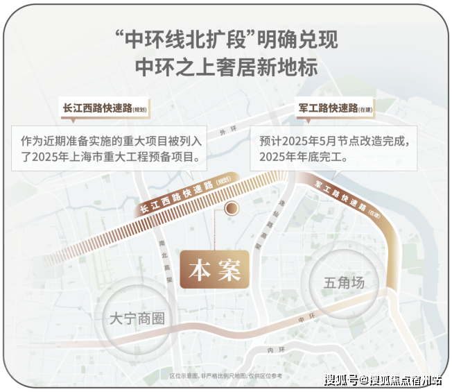 作为上海市重大工程,「中环北抬」通过军工路、长江西路、沪太路三条快速路互联,重构浦西北交通骨架。这项工程不仅延伸中环线,更通过立体路网打造串联宝山、杨浦、静安的「城市交通脊梁」,竣工后将形成复合功能交通带,推动沿线板块价值升级。